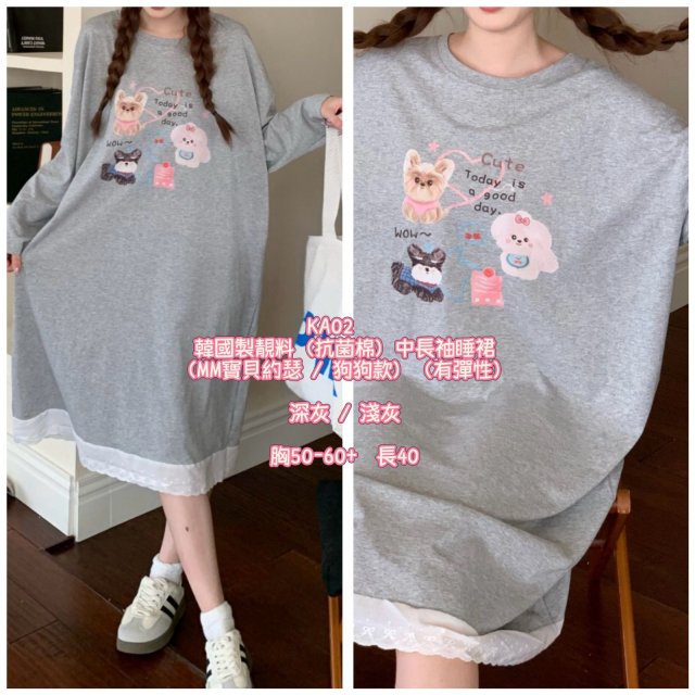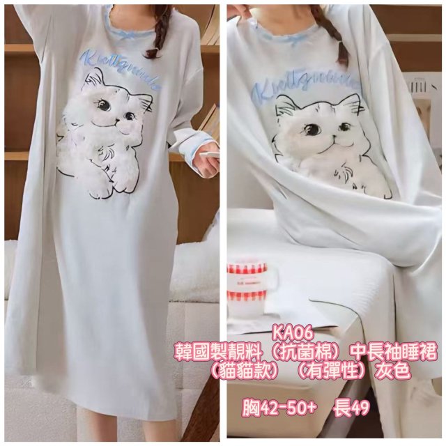 2025 9月韓國連線 韓國製靚料(抗菌棉)中長袖睡裙(貓貓款)(有彈性)灰色