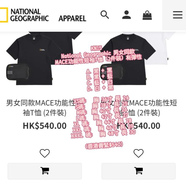 2025 9月韓國連線 National Geographic 男女同款MACE功能性短袖T恤 (2件裝) 有彈性