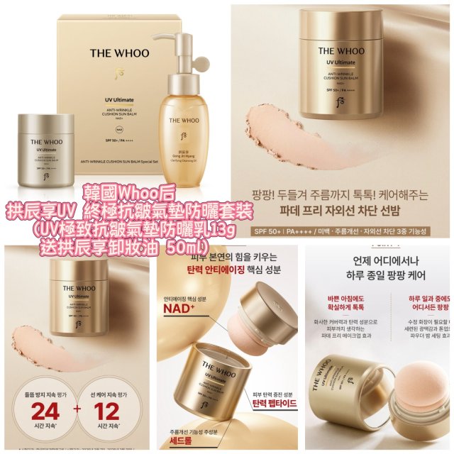 2025 9月韓國連線 韓國Whoo后拱辰享UV 終極抗皺氣墊防曬套裝(UV極致抗皺氣墊防曬乳13g 送拱辰享卸妝油 50ml)