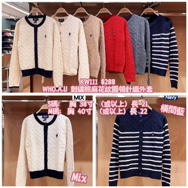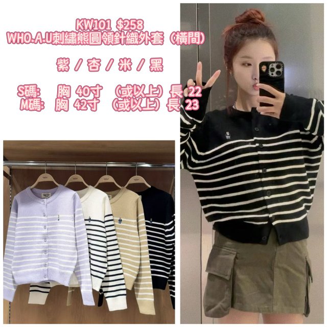 2025 9月韓國連線 WHO.A.U刺繡熊圓領針織外套(橫間)