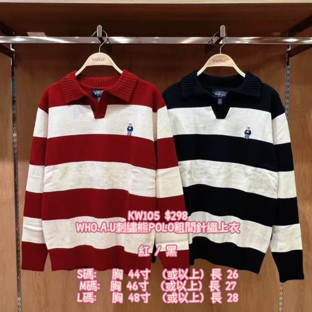 2025 9月韓國連線 WHO.A.U 刺繡熊粗橫間Polo 衞衣
