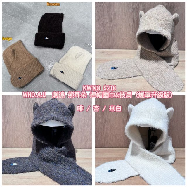 2025 9月韓國連線 WHO.A.U 刺繡 熊耳朵 連帽圍巾&披肩(爆單升級版)