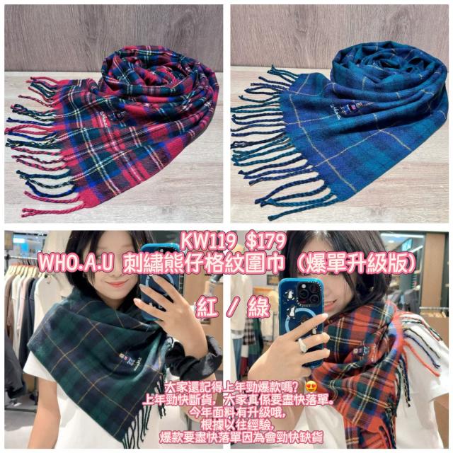 2025 9月韓國連線 WHO.A.U 刺繡熊仔格紋圍巾(爆單升級版)