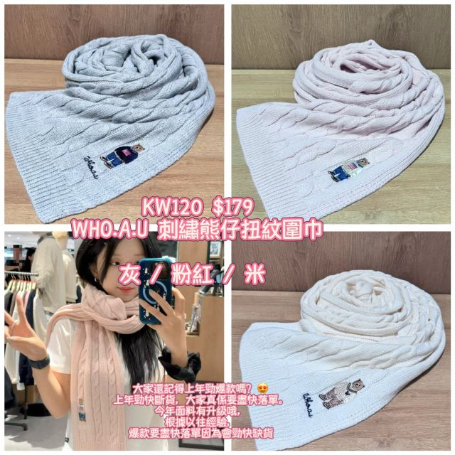 2025 9月韓國連線 WHO.A.U 刺繡熊仔扭紋圍巾