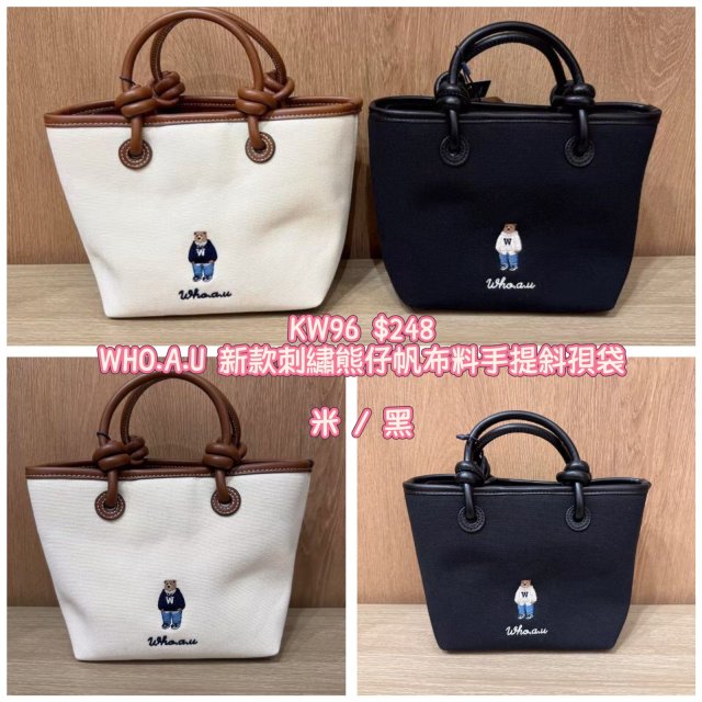 2025 9月韓國連線 WHO.A.U 新款刺繡熊仔帆布料手提斜孭袋