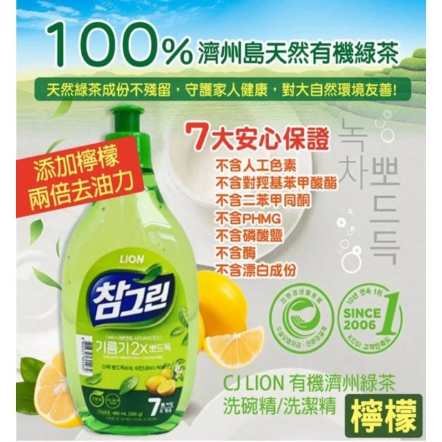 (10月8直播) 韓國 CJ LION 有機濟州綠茶升級版兩倍去油檸檬洗碗精 500g