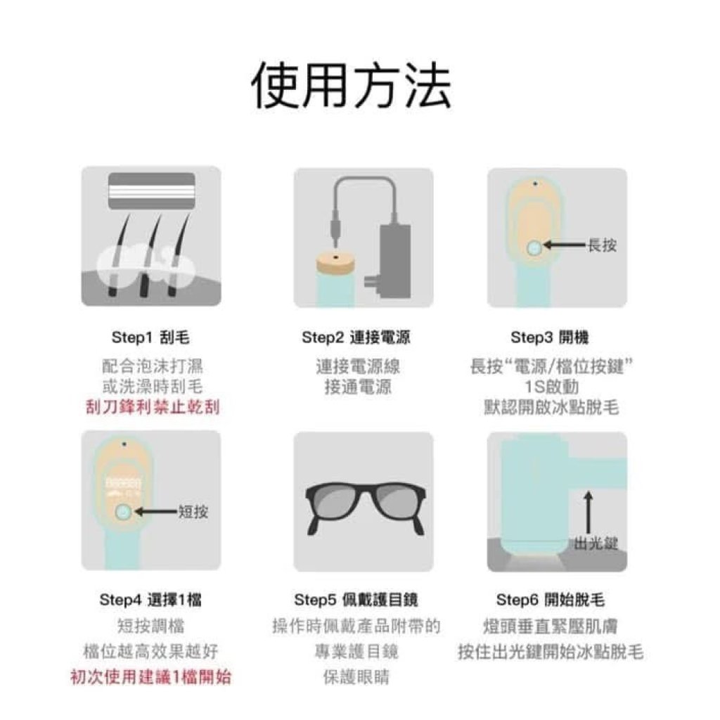 🌟使用方法,首先在在脫毛的位置剃掉毛毛然後抹掉,根據脫毛位置而選擇部機用邊個頭,戴上附送的眼鏡,然後將脫毛器貼到脫毛位置便可以,之後查返蘆薈或保濕產品便可以