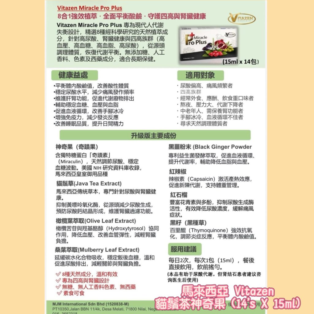 ㊙️Vitazen Miracle Pro Plus 專為現代人代謝失衡設計,精選8種經科學研究的天然植萃成分,針對高尿酸、腎臟健康與四高族群(高血壓、高血糖、高血脂、高尿酸),從源頭調理體質,恢復代謝平衡。無添加糖、人工香料、色素及西藥成分,適合長期保健。